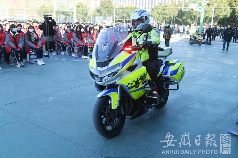 2021年12月1日,安徽省阜陽(yáng)交警一大隊(duì)的交警“鐵騎”為學(xué)生進(jìn)行鐵騎技能表演。