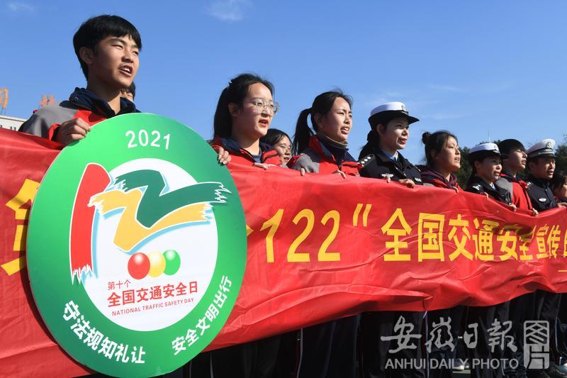 2021年12月1日,安徽省阜陽(yáng)科學(xué)技術(shù)學(xué)校的學(xué)生和交警手拿宣傳牌和條幅集體宣誓:“守法規(guī)知禮讓,安全文明出行”。